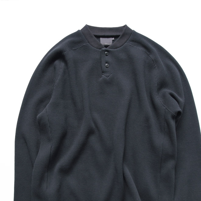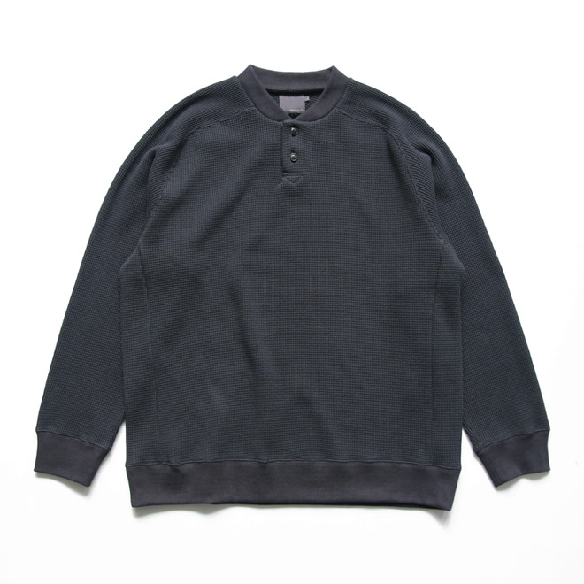 ワッフル編み生地によるヘンリーネックプルオーバー。