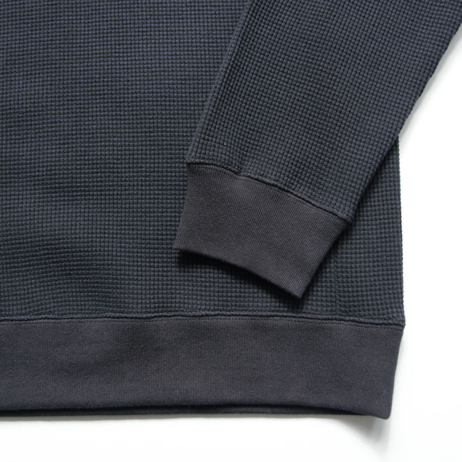 表層はメンフィスコットンによるドライタッチですが、生地そのものはもっちりという感じ。ワッフル編み、あるいはハニカム編みとは厚みが出るような編み方なので、例外なく肉厚感があるのですが、こちらはしっかり詰まった感じがあります。