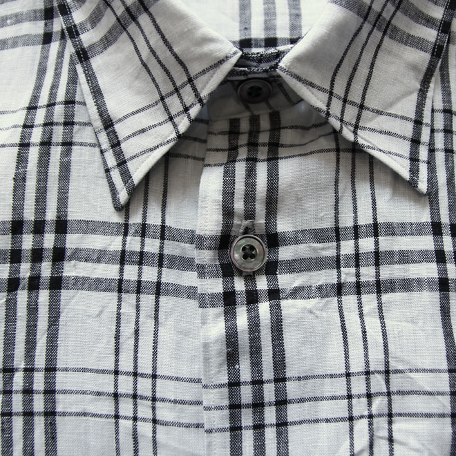 生地は薄地のリネン100、清涼感を感じさせる白地のオーセンティックなチェック柄です。