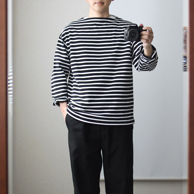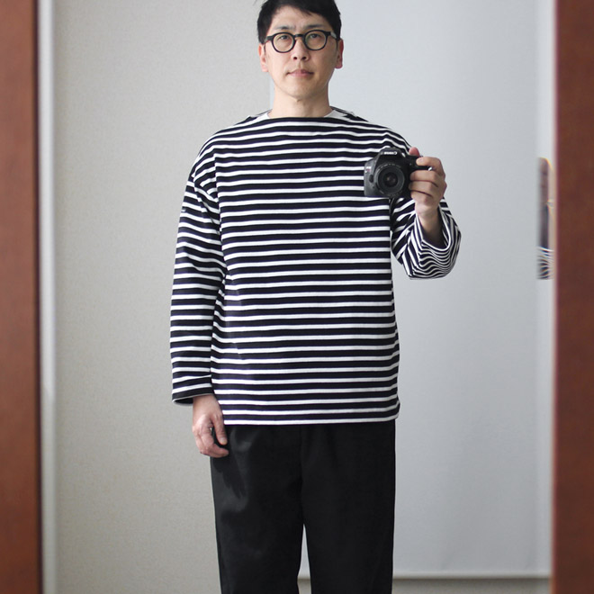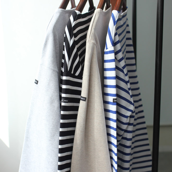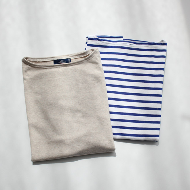バスクシャツとは、漁師や海兵隊など海の上での仕事に従事する人々がある種のユニフォームとして古くから愛した伝統的なアイテムです。洗ってくたびれても味のある肉厚のコットン地、バスクシャツの象徴であるボートネックに、9分丈くらいの袖。大昔から今に至るまで、質感やかたちをほとんど変えずに多くの人々に愛用されています。