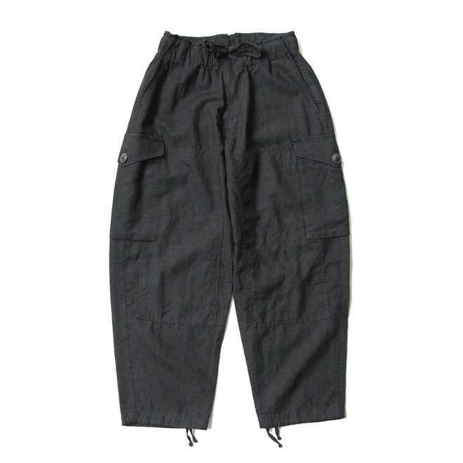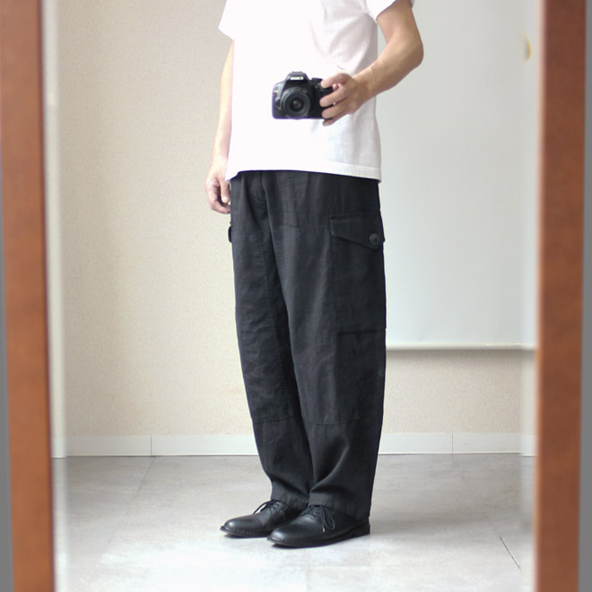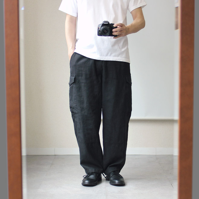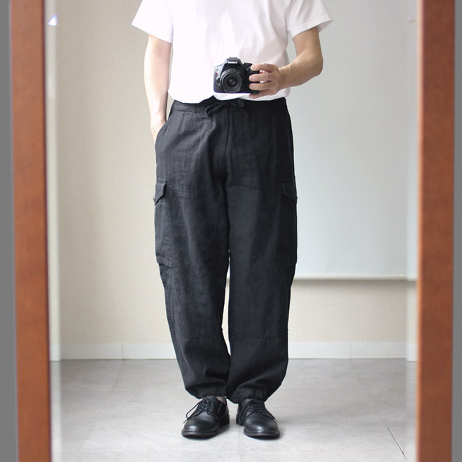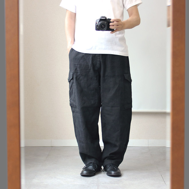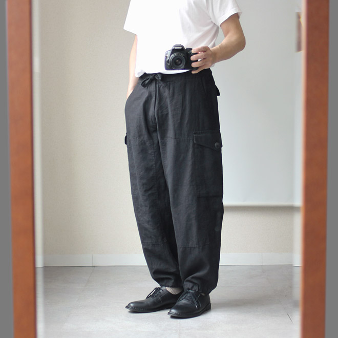 リネンコットンのブラックカーゴパンツ、格好いいです。