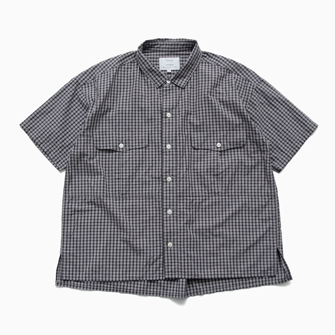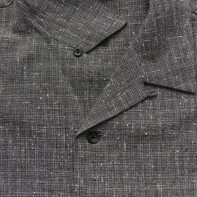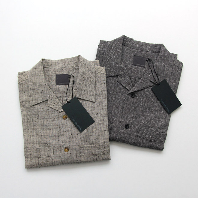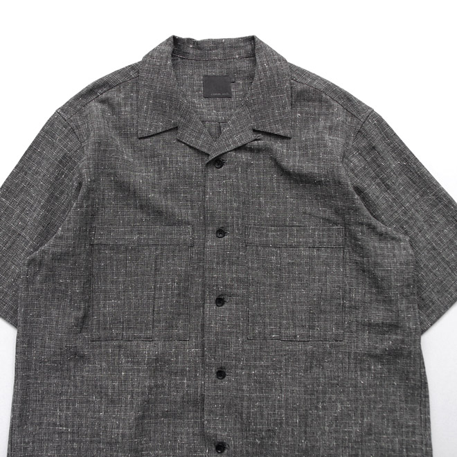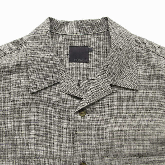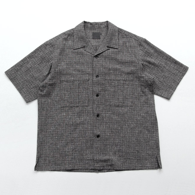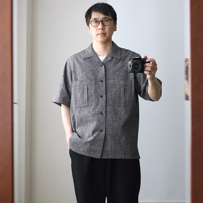 オープンカラーにやや大ぶりな両胸ポケット、裾はストレートでサイドスリット入り。シルエットはゆったり型でオーバーサイズ気味で設定されています。