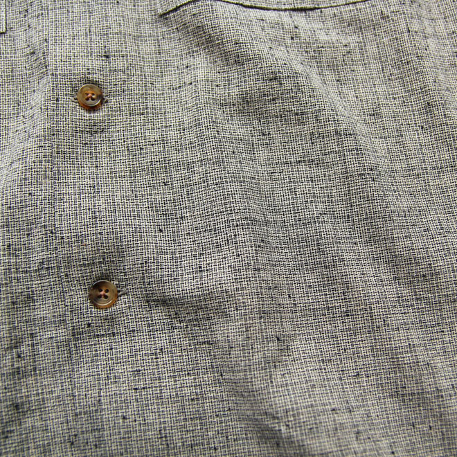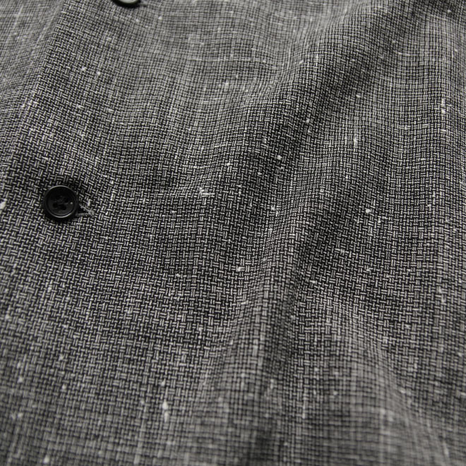 ヨーロッパ産のブレンドリネンとインド産長綿を混紡し、ネップ糸を混ぜて織り上げた表情豊かな綿麻生地を使用。ランダムなミニチェックのような織り柄をベースに、ネップと麻のフシとが相まって自然な風合いを加え、レトロ、シック、モダン、、いろいろなイメージが湧く不思議な雰囲気です。