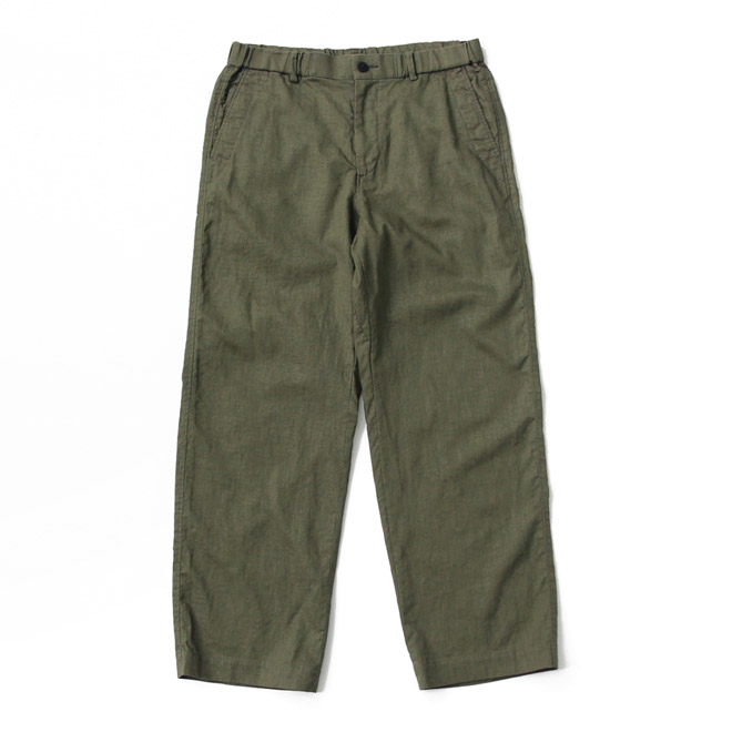 ウエストはゴム+ドローコードのイージーパンツの仕様、シルエットは股上や尻まわりに余裕を取り過ぎないクラシックなストレート型となります。
