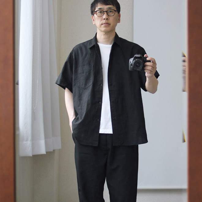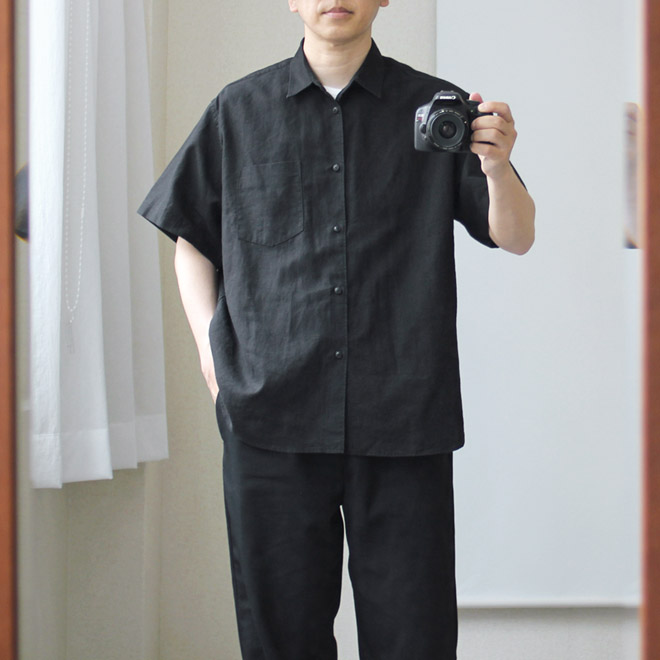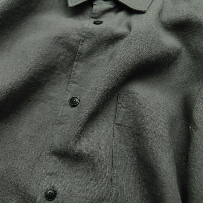 リネン90/コットン10のしっかりした平織り生地を使用しています。リネン特有の風合いと優れた通気性はもちろん、ルーズシルエットによって生まれるリネン生地ならではのドレープ感も魅力です。