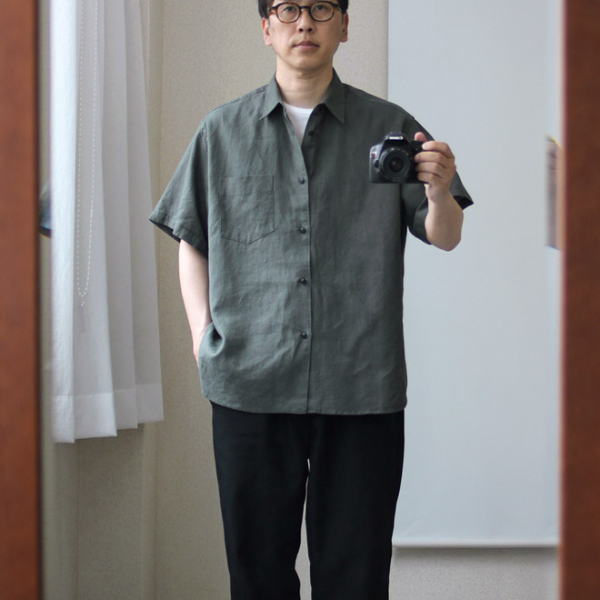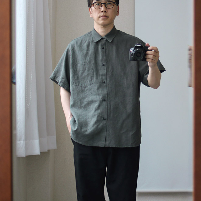 リネン・コットン素材、レギュラーカラーの半袖シャツです。